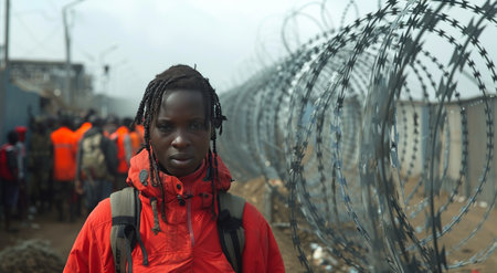 Refugees move with suitcases and backpacks, facing challenges at a border filled with fences while seeking hope and safety.