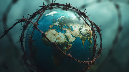 A symbolic representation of the world trapped within barbed wire, highlighting themes of conflict and environmental concern.