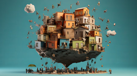 A vibrant hillside community featuring colorful rooftops amid lush greenery and a cloudy sky, creating a picturesque and lively atmosphere.