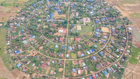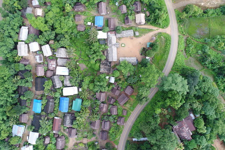 Aerial top view of residential local houses in Mon village, nature trees, Kanchanaburi, Thailand in urban city town in Asia, buildings.