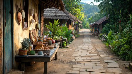 A serene village scene with rustic huts, vibrant plants, and a charming walkway lined with handmade crafts.