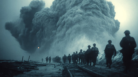A group of soldiers walking toward a massive explosion in a wartime setting
