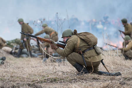 St. Petersburg, Russia - April 26, 2015: Members of the military-patriotic club during the historical reconstruction of World War II battle for the Seelow Heights, Soviet Russian troops in the offensive on the battlefield
