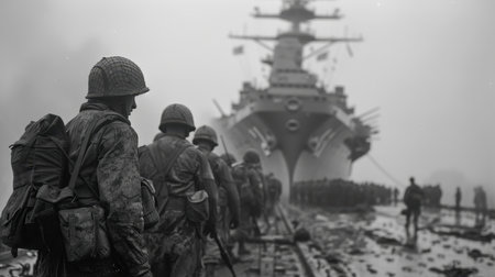 A military landing party before landing on an aircraft carrier in the ocean during World War II . Soldiers on the deck of a military aircraft carrier at sea.