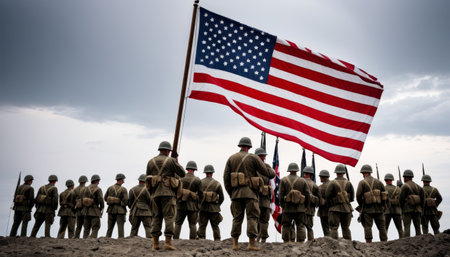 A group of soldiers in historical uniforms solemnly raise the American flag on a gloomy day.. AI Generation