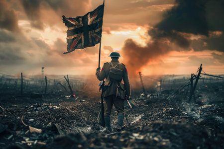 A soldier holding a flag and looking out over a battlefield, AI generated