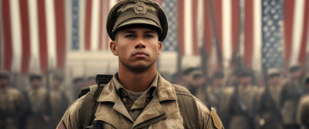 USA army soldiers saluting on a background of sunset or sunrise and USA flag. Greeting card for Veterans Day, Memorial Day, Independence Day. America celebration.