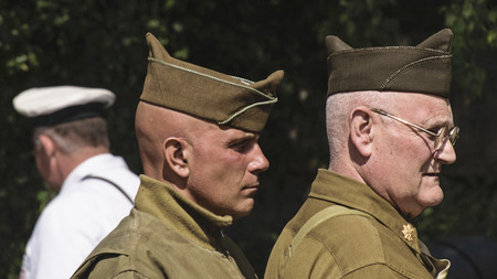 Hel, Poland - August 2022 Military troops marching during 3 May Polish Constitution Day ceremonial patriotic parade. Polish armed forces tanker military parade. old guns and cars. Feast of Polish Armed Forces Day, American soldiers with US flag on parade