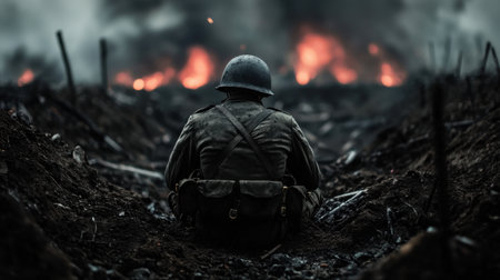 A soldier sits in a trench, surrounded by devastation and flames, reflecting the somber reality of war's impact on individuals and the human spirit in turmoil.