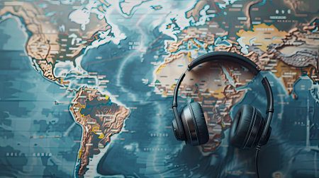 Contact global concept with a top-down view of a headset and map, illustrating the seamless connectivity in our modern world