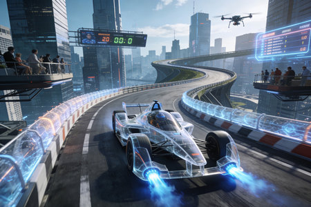 Experience the thrill of high-speed racing with futuristic cars featuring neon lights in motion. This dynamic image captures excitement and innovation on a cutting-edge race track.