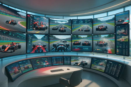 Control desk with panoramic wall of monitors streaming high-speed race cars, speed data, and track stats in real time. Concept of office, news, digital, technology, advertisement.