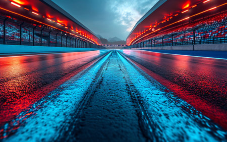 Captivating view of a racing track at sunset, showcasing vibrant lights reflecting off the wet asphalt, embodying speed and excitement in sports action.