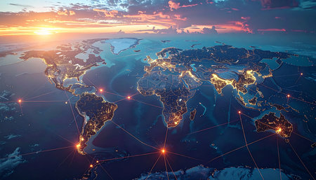 A glowing world map with interconnected cities and ports at sunset. Clear details and vibrant colors enhance ...