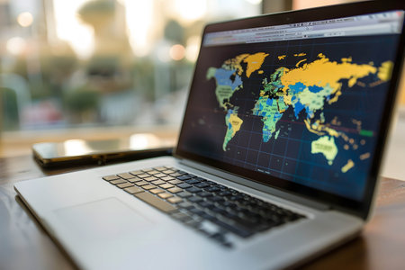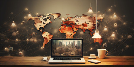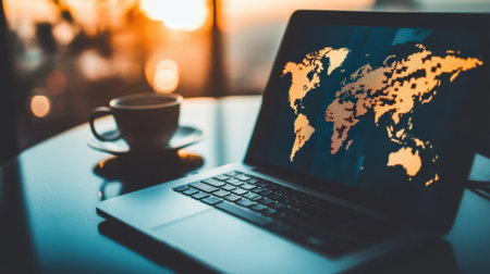 A cozy scene featuring a laptop with an illuminated world map on its screen, paired with a coffee cup, set against a backdrop of a warm sunset glow.