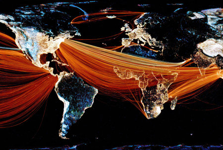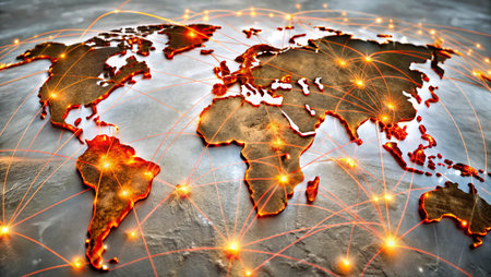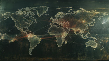 A luminous world map glows in the dark, showcasing a complex web of interconnected data points and communication lines. This visualization represents the pulse of the global economy, illustrating international trade routes, digital information flow, and the futuristic infrastructure of a connected planet.