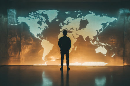 A silhouette stands before a glowing map, contemplating global connections in a dimly lit space that inspires exploration.