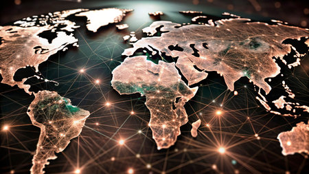 A 3D rendering of a global network, with interconnected nodes and digital communication lines.