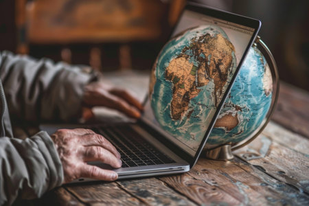 Hands are placed on a laptop keyboard as a globe of Africa rests nearby, creating a warm atmosphere in a rustic setting, showcasing a blend of technology and exploration.