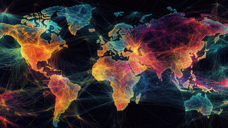 This vibrant world map illustration features a dynamic network of lines in colorful hues, symbolizing global connections and technological innovation.