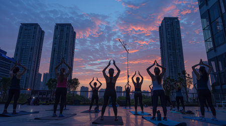 Yoga practitioners meditate and pose on mats at sunset, creating a serene atmosphere among urban buildings.