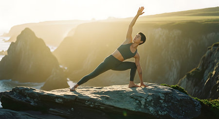 A woman performs a yoga pose on a rocky cliff overlooking the ocean during sunset, with dramatic lighting and natural scenery.