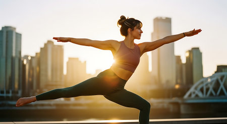 A woman in athletic wear performing a yoga pose at sunrise with a city skyline in the background.