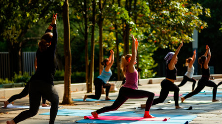A serene yoga class at sunrise, participants in a tranquil outdoor setting, symbolizing peace and mindfulness. Resplendent.