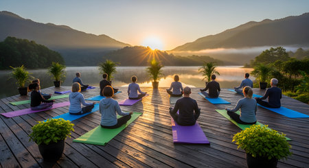 A group of people practices yoga meditation in a lotus pose on a wooden deck overlooking a calm lake at sunrise. The scene is framed by mountains and lush greenery, evoking a sense of peace, wellness, and connection with nature.