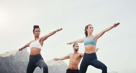 We are warriors. Cropped shot of three young people standing in a warrior position while doing yoga on the beach.