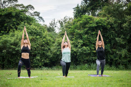 Group of young woman doing yoga at park in the morning,Female friend exercising on green grass with yoga mat