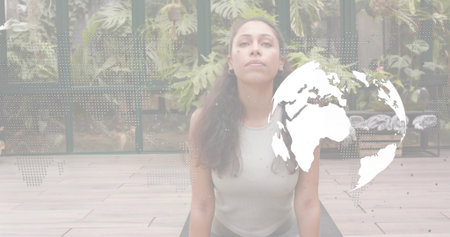 Stretching curly-haired woman wearing tank reaching forward on mat in yoga studio, globe overlay. Bend, flexibility, group, gym, vibrant, focus, wellness