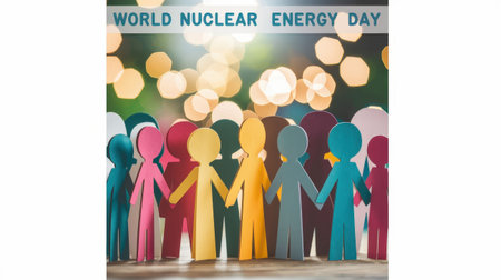 A vibrant display of colorful paper figures holding hands, symbolizing unity and awareness for World Nuclear Energy Day. This image highlights the importance of nuclear energy in a sustainable future, set against a backdrop of soft bokeh lights