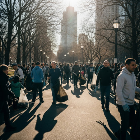 Diverse volunteers collaborate on a large-scale community litter cleanup project under harsh sunligh