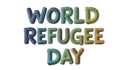 The words WORLD REFUGEE DAY are displayed in large, colorful letters that resemble inflated balloons. Each letter has a gradient of colors, transitioning from blues and greens to yellows and oranges. The text is presented against a solid black background.