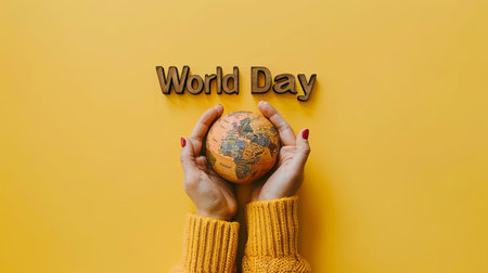 World Day concept with female hands holding a globe on a yellow background
