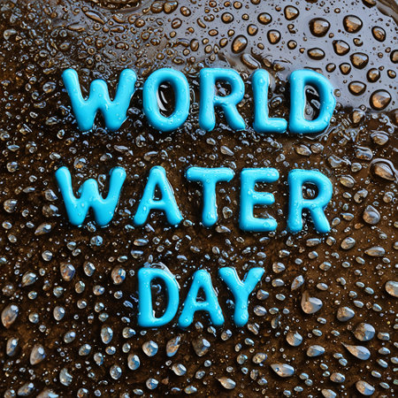 World water day text and water drops on dark brown background.