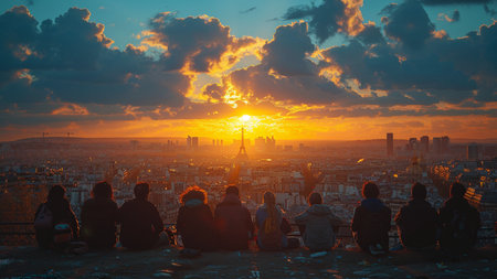 Tourists on the Eiffel tower in Paris at sunset.