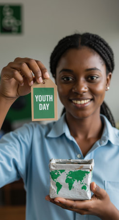 Happy young African American woman holds youth day tag. International youth day concept showcasing youth global impact.