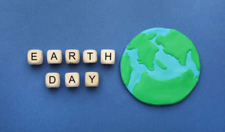 Phrase Earth Day made with wooden cubes and planet model on blue background, flat lay