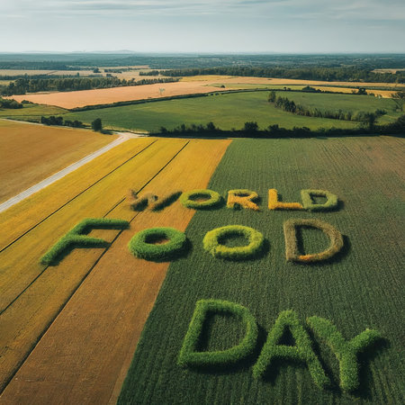 Aerial view of a field with 'World Food Day' written in crop patterns.