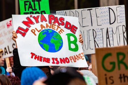 Ecological protestors march for change. There is no planet b is shown on a homemade placard held by ecological demonstrators during a peaceful march in a city center.