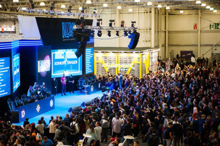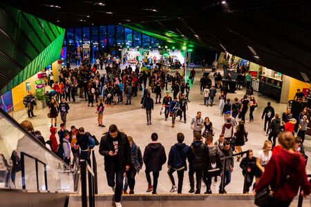 Moscow, Russia-October 6, 2019: a crowd of people in front of the blizzard stage at the IgroMir Russia festival