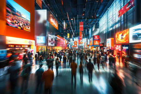 Dynamic trade show scene blurred view of a busy exhibition with colorful booths and engaged crowds