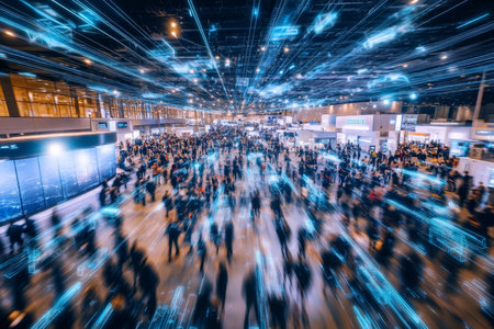 Bustling high-tech convention center with innovative exhibits
