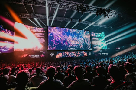 Spectators fill the arena for an esports event, surrounded by colorful lights and large screens, creating a thrilling and immersive gaming experience