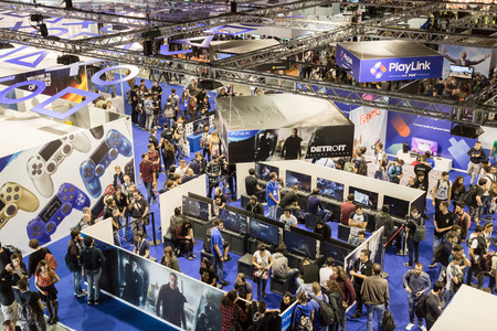 MILAN, ITALY - SEPTEMBER 29: Top view of people and booths at Games Week 2017, event dedicated to video games and electronic entertainment on SEPTEMBER 29, 2017 in Milan.