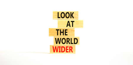 Look at the world wider symbol. Concept words Look at the world wider on wooden blocks on a beautiful white table white background. Business and look at the world wider concept. Copy space.