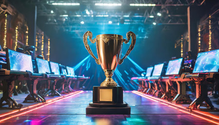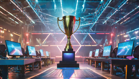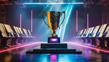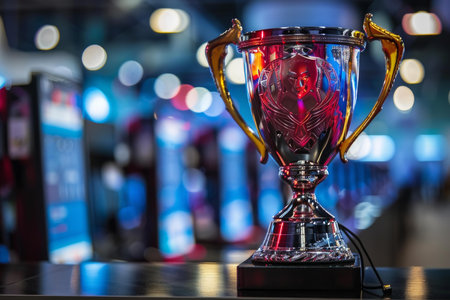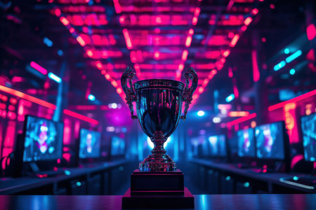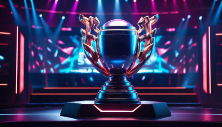 Esports championship trophy showcase modern gaming arena digital photography neon-lit environment close-up view competitive spirit