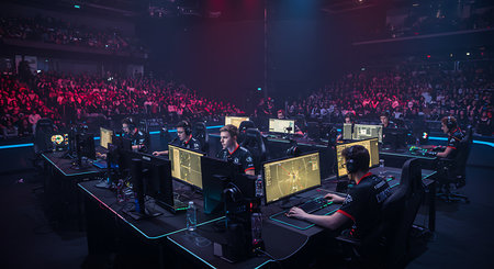 Action-packed esports tournament scene, players intensely focused, audience cheering in the background.